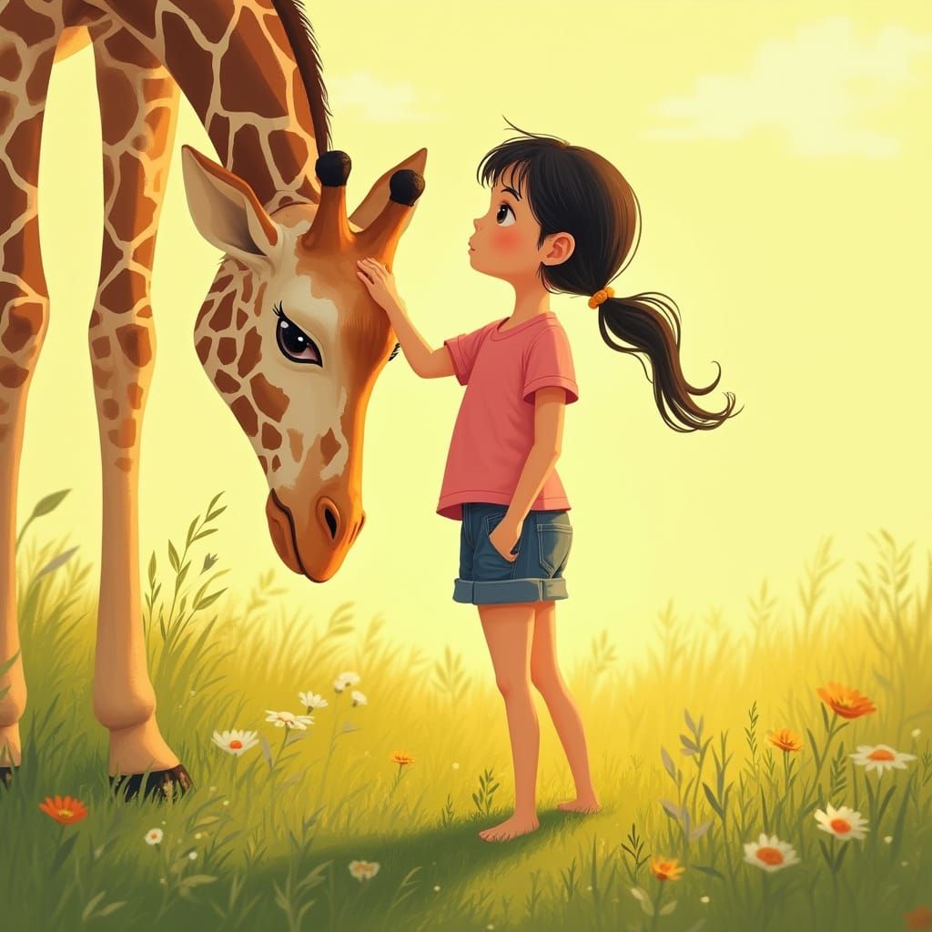 This image shows a young girl with black hair, wearing pink and blue, joyfully interacting with a giraffe in a sunlit field. Rendered in a charming, painterly storybook style with a heartwarming palette.