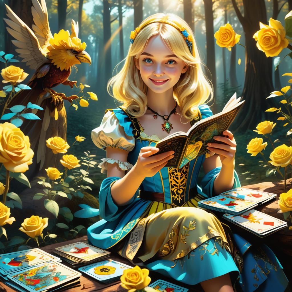 A vibrant digital artwork of Alice in Wonderland in a sunlit forest reading tarot cards. A phoenix rests near her with yellow roses surrounding them, rendered as stylized 3D art.