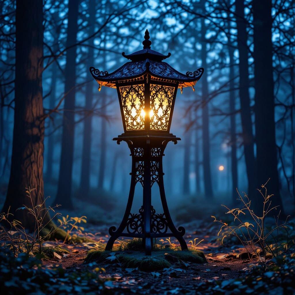 This image shows an ancient, ornate filigree lantern casting light in a dark, mysterious forest at night. The delicate metalwork glows softly.