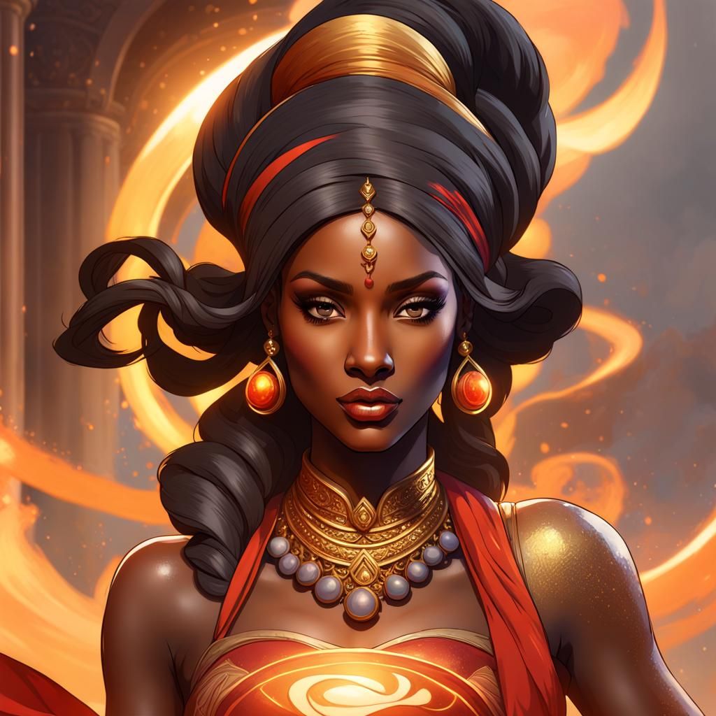 This image shows a beautiful Black female genie seated in a swirl of smoke emerging from Aladdin's lamp. The genie wears red, orange, and gold clothing, depicted with dynamic lighting and intricate details as digital art.