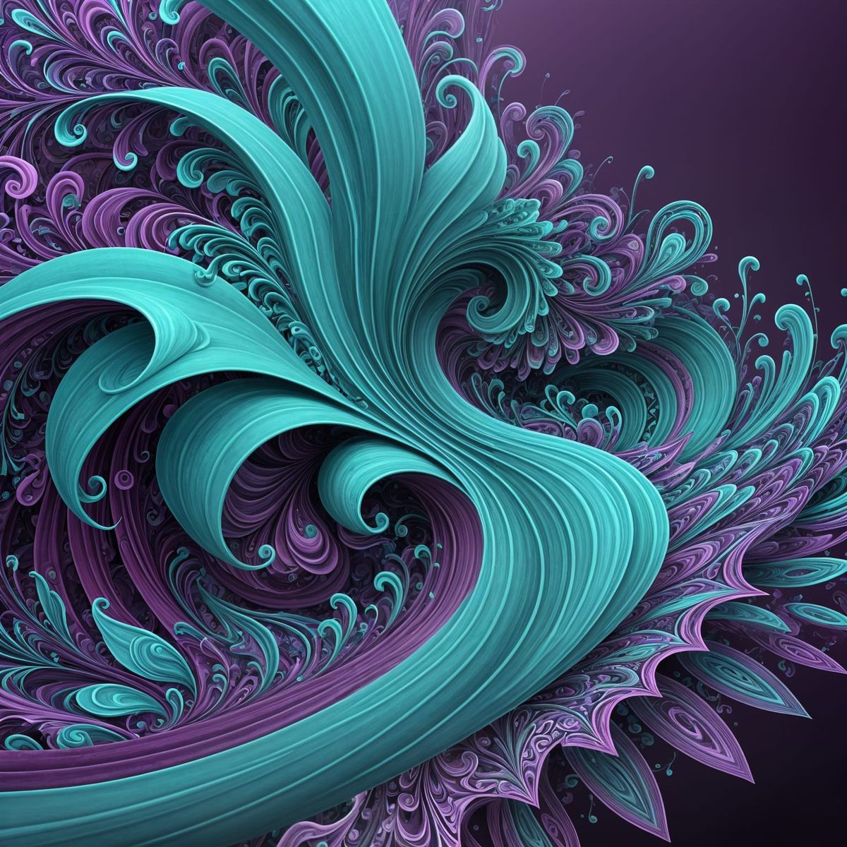 This image shows an abstract design featuring turquoise and purple hues. The design incorporates vector fractal elements with 3D shading, resulting in a visually complex wave pattern.