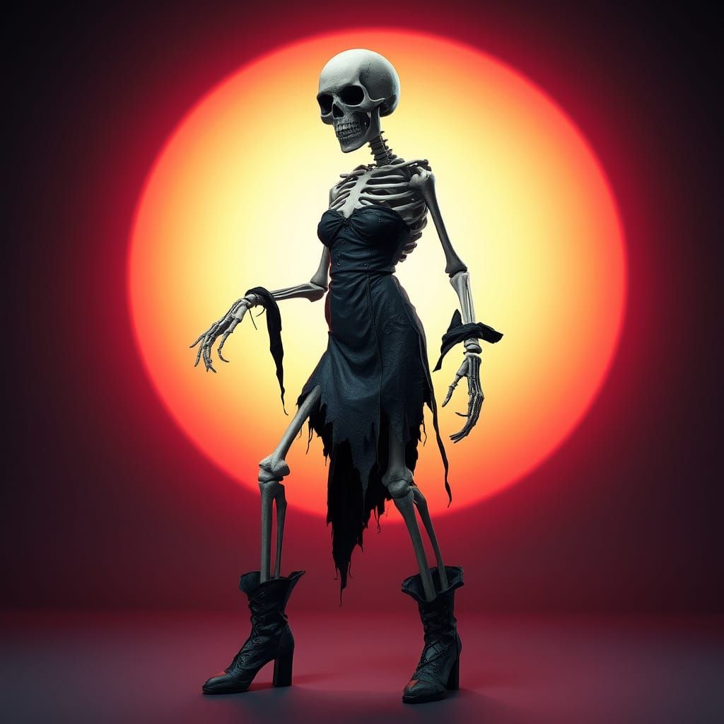 A striking 3D digital art image of a skeleton woman posed against a vibrant, radial gradient backdrop, with a focus on cinematic lighting and detailed textures, reminiscent of Industrial Light and Magic's style.