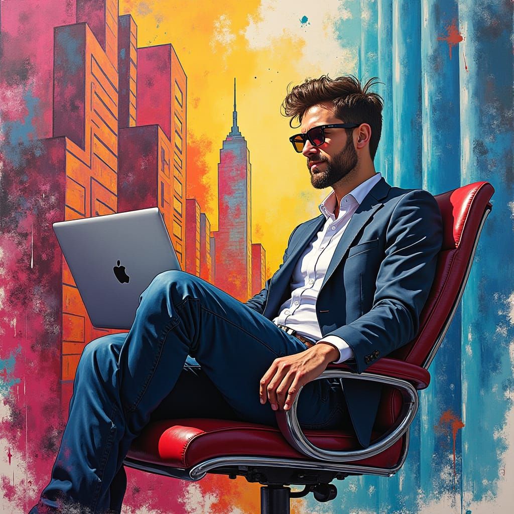 This image shows a vibrant graffiti art piece depicting a relaxed office worker within a modern cityscape. The artwork features bold typography, splash art elements and high contrast polychromatic hues.