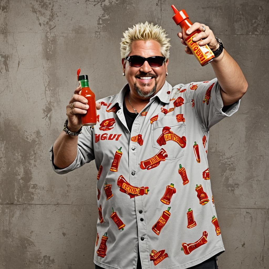 This image shows Guy Fieri holding a bottle of hot sauce. The composition is simple and focuses on the celebrity chef and the product he is holding.