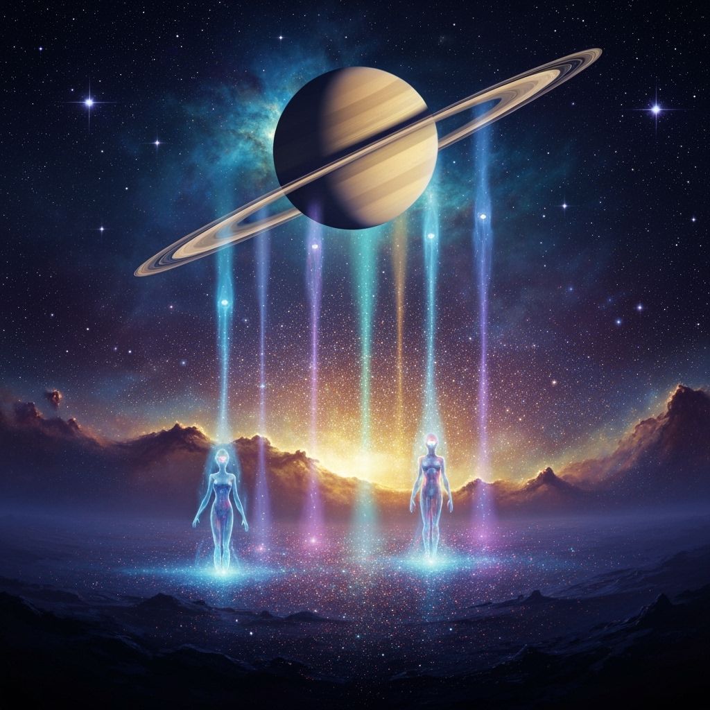 This image shows ethereal beams of light from Saturn's rings coalescing into glowing humanoid figures against a vibrant, cosmic nebula. It's rendered in a dynamic, light-and-shadow rich art style.