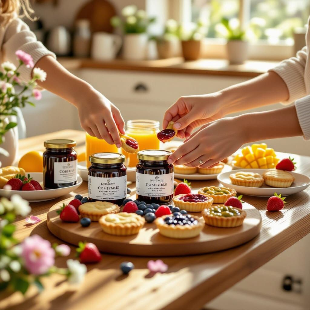 This image shows a close-up, photorealistic scene of hands spreading fruit jam on cookies and tartlets on a wooden table. Berries and flowers add a natural, warm touch.