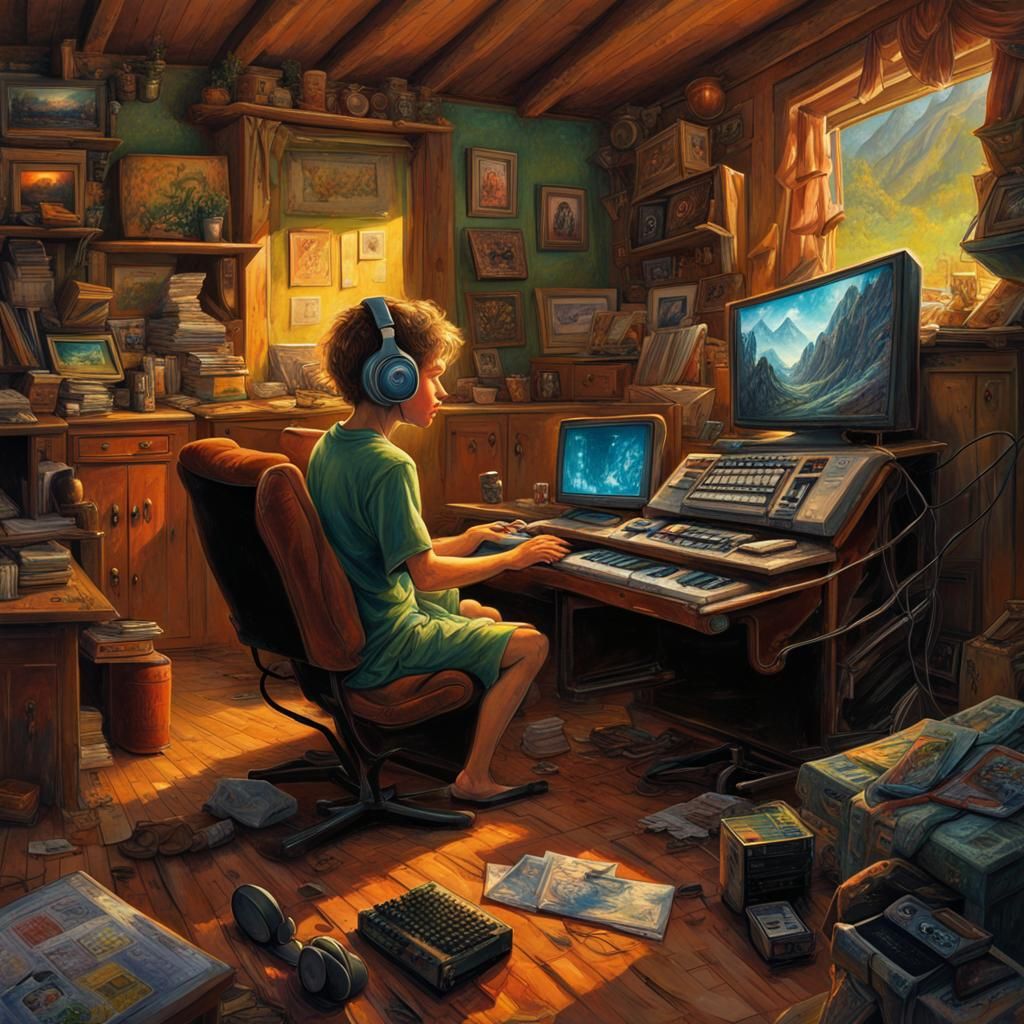 A low-angle, cinematic shot of a boy gaming in a recliner. He's holding a keyboard, wearing headphones, and has a drink on the table next to a monitor displaying video games. Colorful digital art.