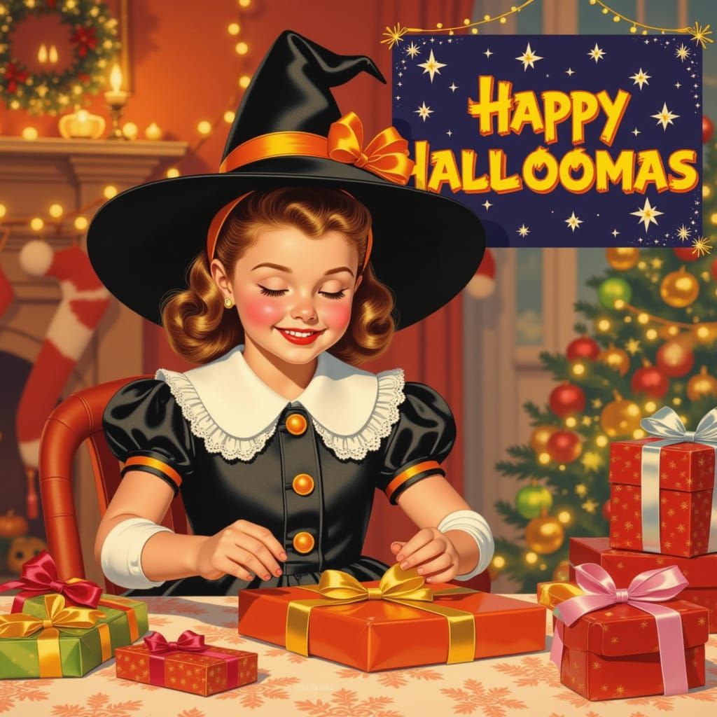 This image shows a 1950s style illustration of a young girl dressed as a witch, happily wrapping Christmas gifts. The scene features vintage advertising art and a nostalgic, festive mood.