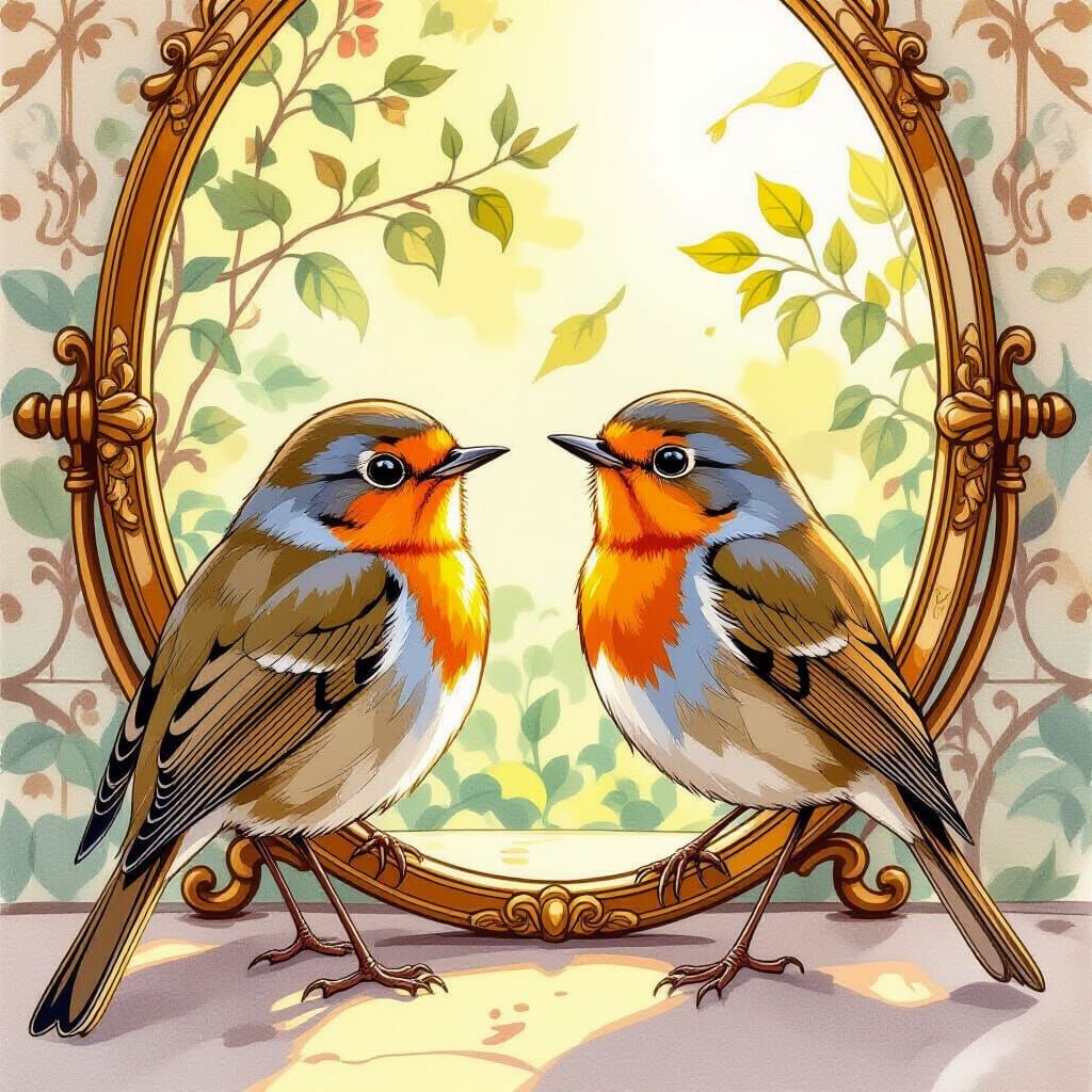 A playful image shows a robin admiring its reflection in a mirror. The artwork blends art deco, art nouveau, and rococo architectural elements with watercolor and pencil sketch techniques.