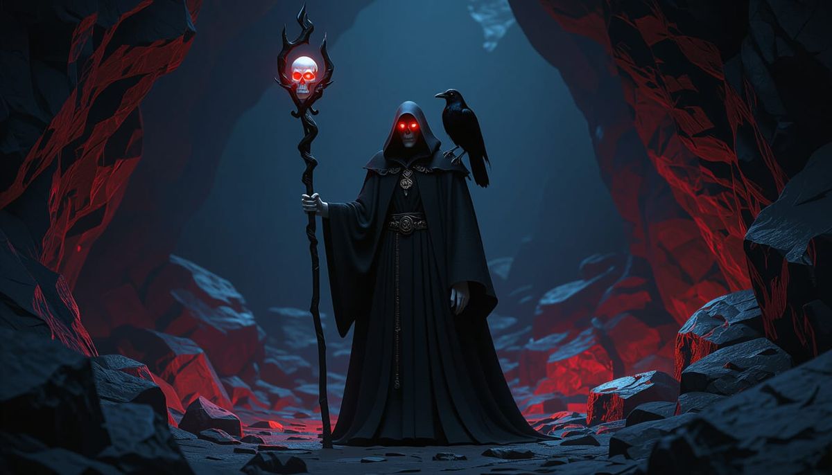 This image shows a tall, pale sorcerer in a dark cave, a raven on his shoulder. Ominous shadows and dramatic lighting create a dark fantasy scene with intricate textures, as 3D rendered digital art.