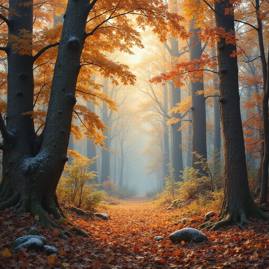 A vibrant autumn forest scene bathed in warm golden light. The frosted leaves and rich colors evoke a fantasy landscape, reminiscent of detailed dramatic paintings with intricate textures.