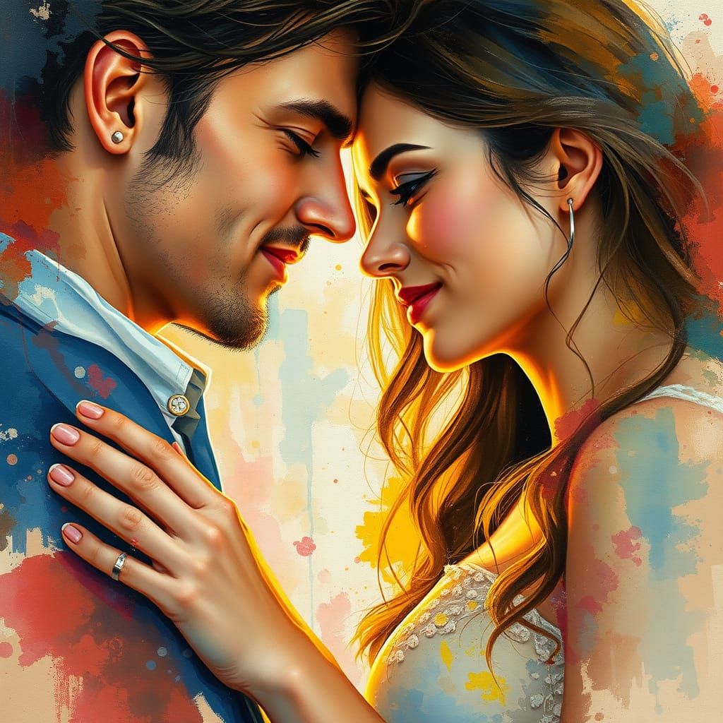 This watercolor portrait captures the tender moment of a loving couple, with soft blended hues and textured strokes evoking a dreamy, hyperrealistic atmosphere. The close-up composition highlights the emotional intensity of the moment, with vibrant colors and expressive brushstrokes adding depth and inti...