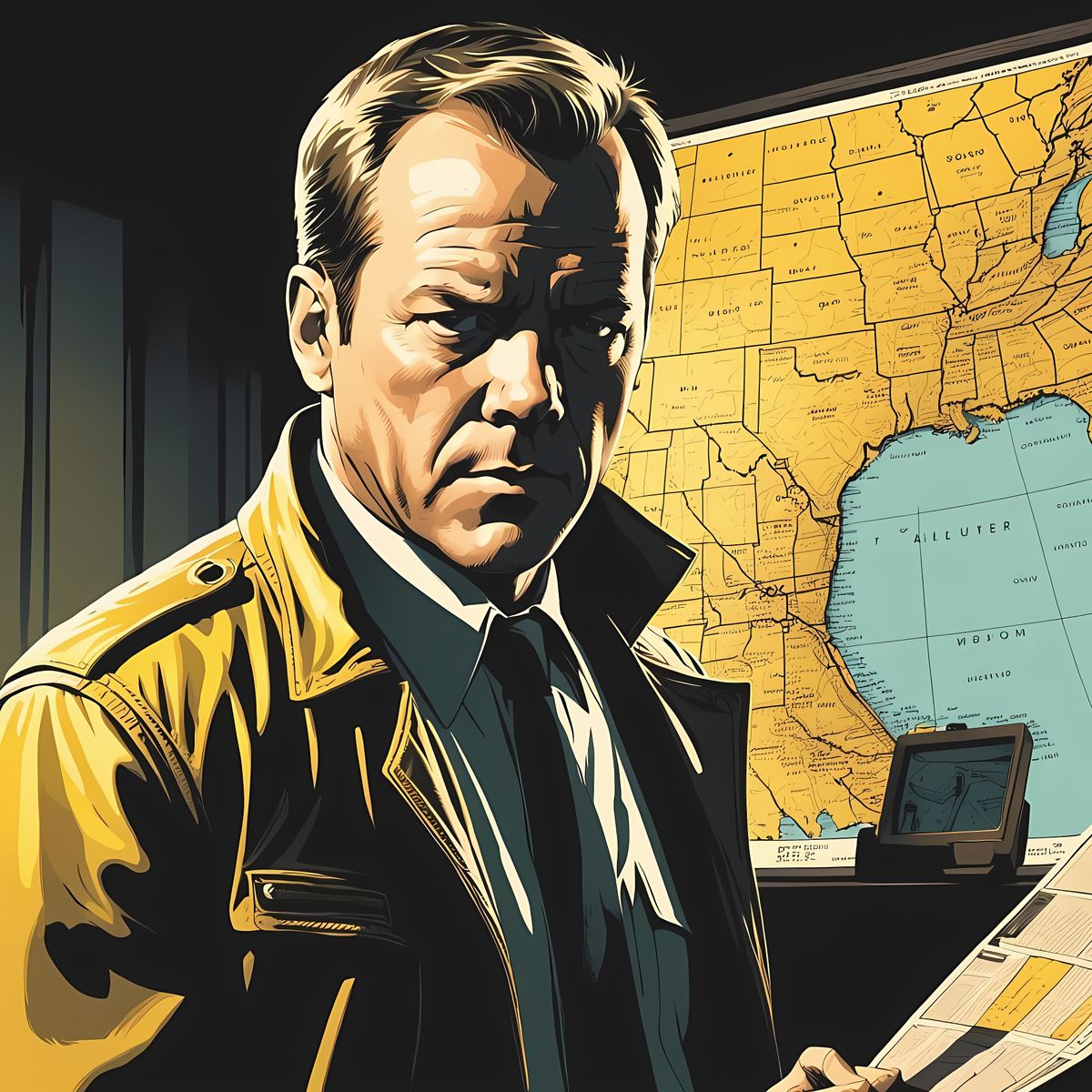 This image shows a comic book scene inspired by 2000s film noir, featuring Jack Bauer in a tense situation. The artwork is in black and white with yellow accents, reminiscent of vintage duotone illustrations.
