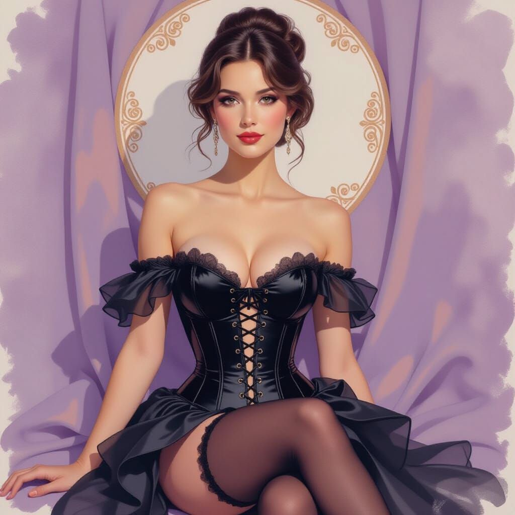 A delicate watercolor painting of a serene woman in a black corset and sheer stockings. The elegant portrait features an intricate updo and a soft purple backdrop, reminiscent of art nouveau.