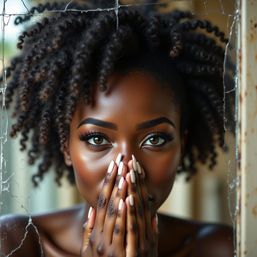 This image shows a beautiful Black woman's horrified reflection in a dirty, cracked bathroom mirror. Her hand is over her mouth, revealing her disbelief.