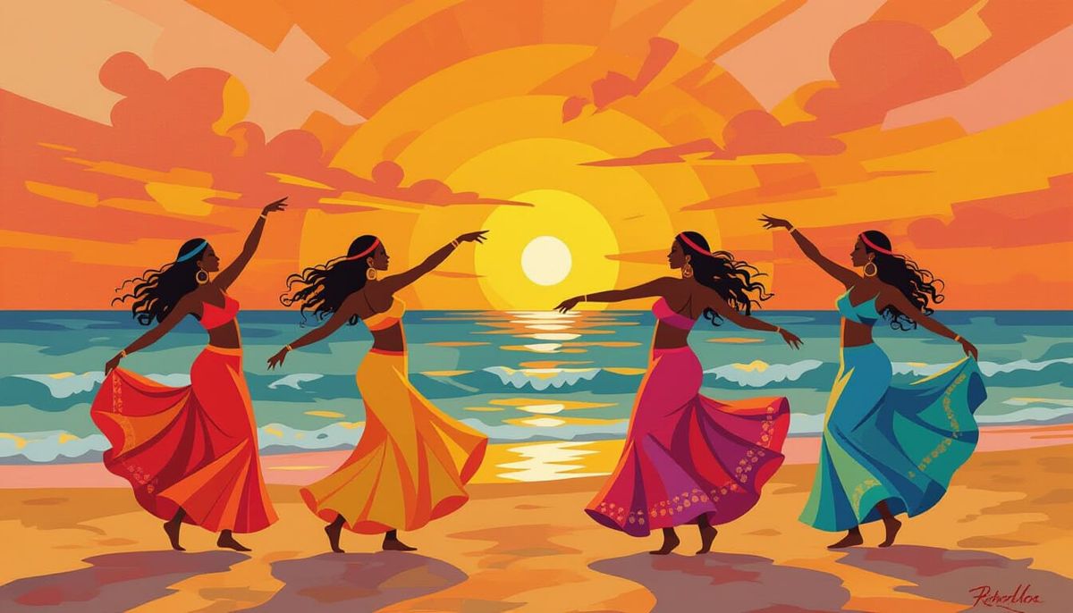 A vibrant image of Latino dancers in colorful clothing on a sunset beach. The artwork features bold, abstract expressionist brushstrokes and complementary colors, reminiscent of Latin American masters.