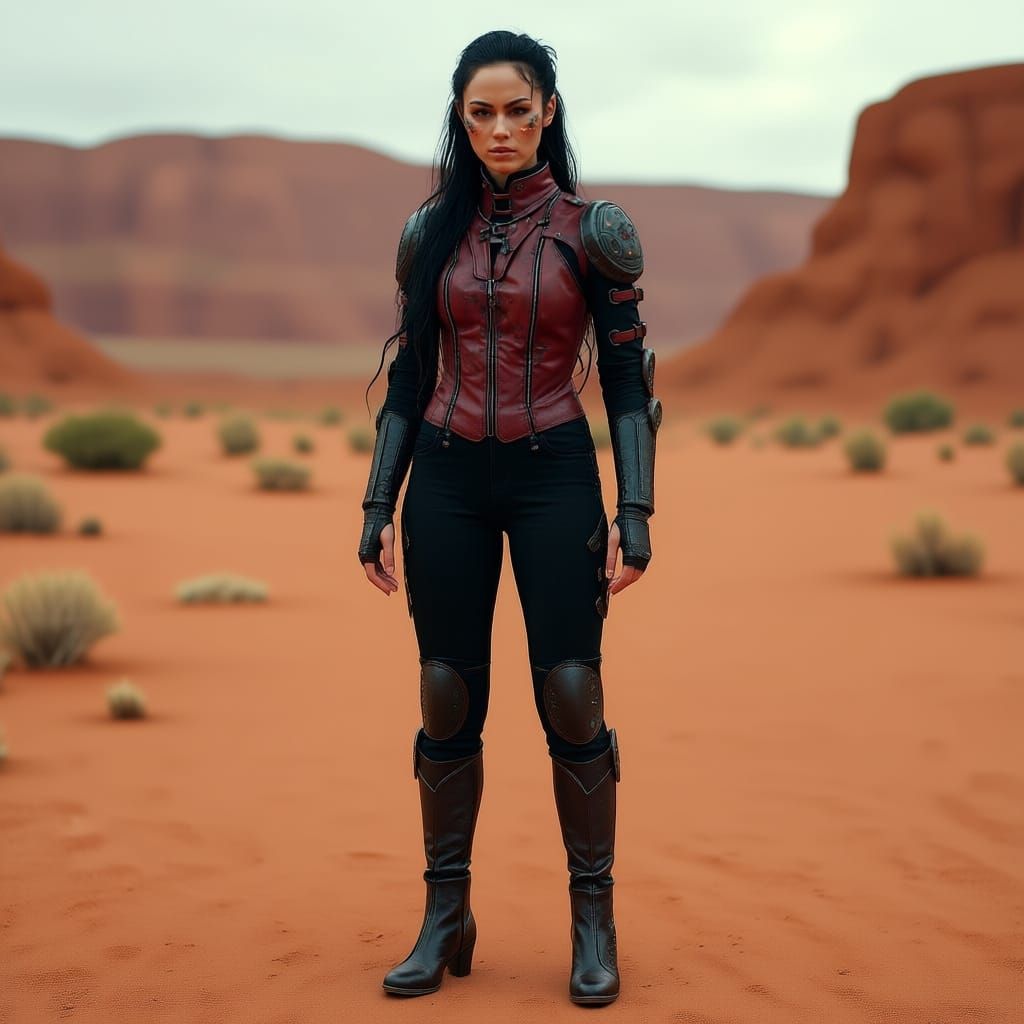 This image showcases a hyper-detailed, avant-garde leather jacket for a female warrior. It merges boho-punk and cyberpunk styles with Klingon symbolism, featuring distressed leather, armor plates, and glowing glyphs.