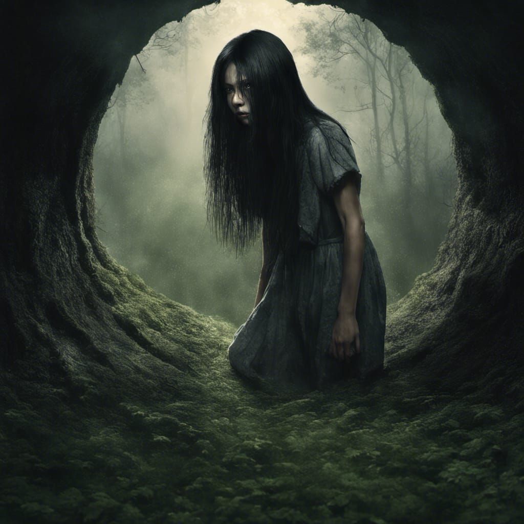 A sinister image of a ghostly figure emerging from a well in a misty forest. The scene evokes a gritty horror aesthetic with dramatic lighting and a palpable sense of fear.