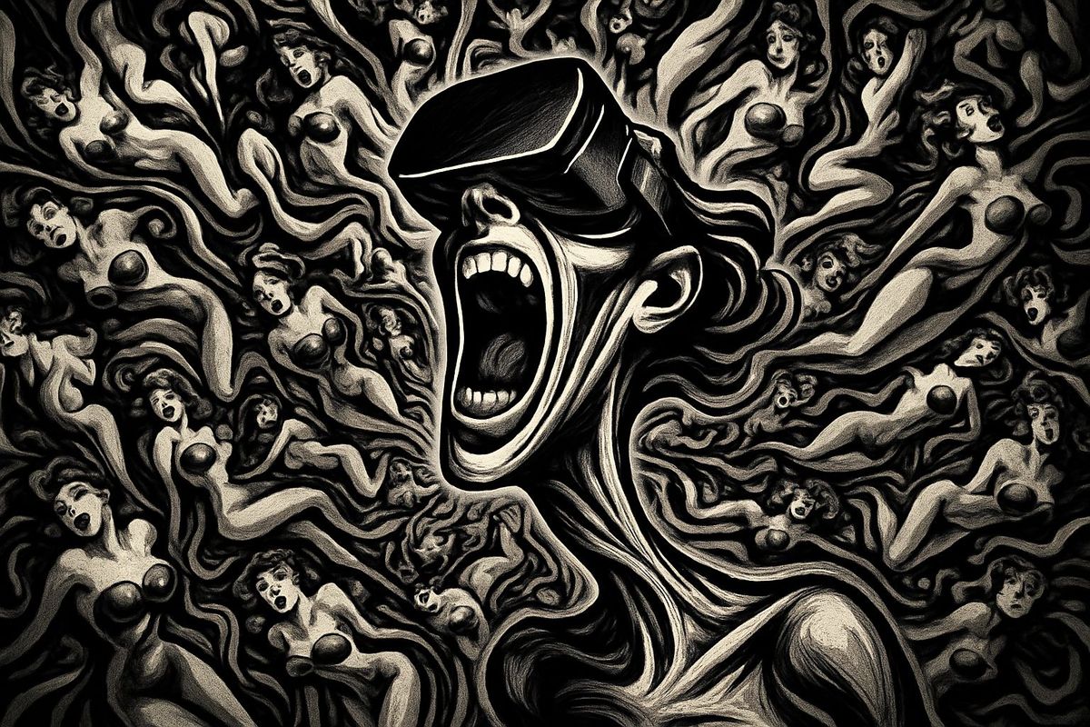 This image shows a VR addict's warped reality, a fusion of stretched forms and morphing patterns creating a mesmerizing kaleidoscope of high-contrast highlights and shadowy depths.
