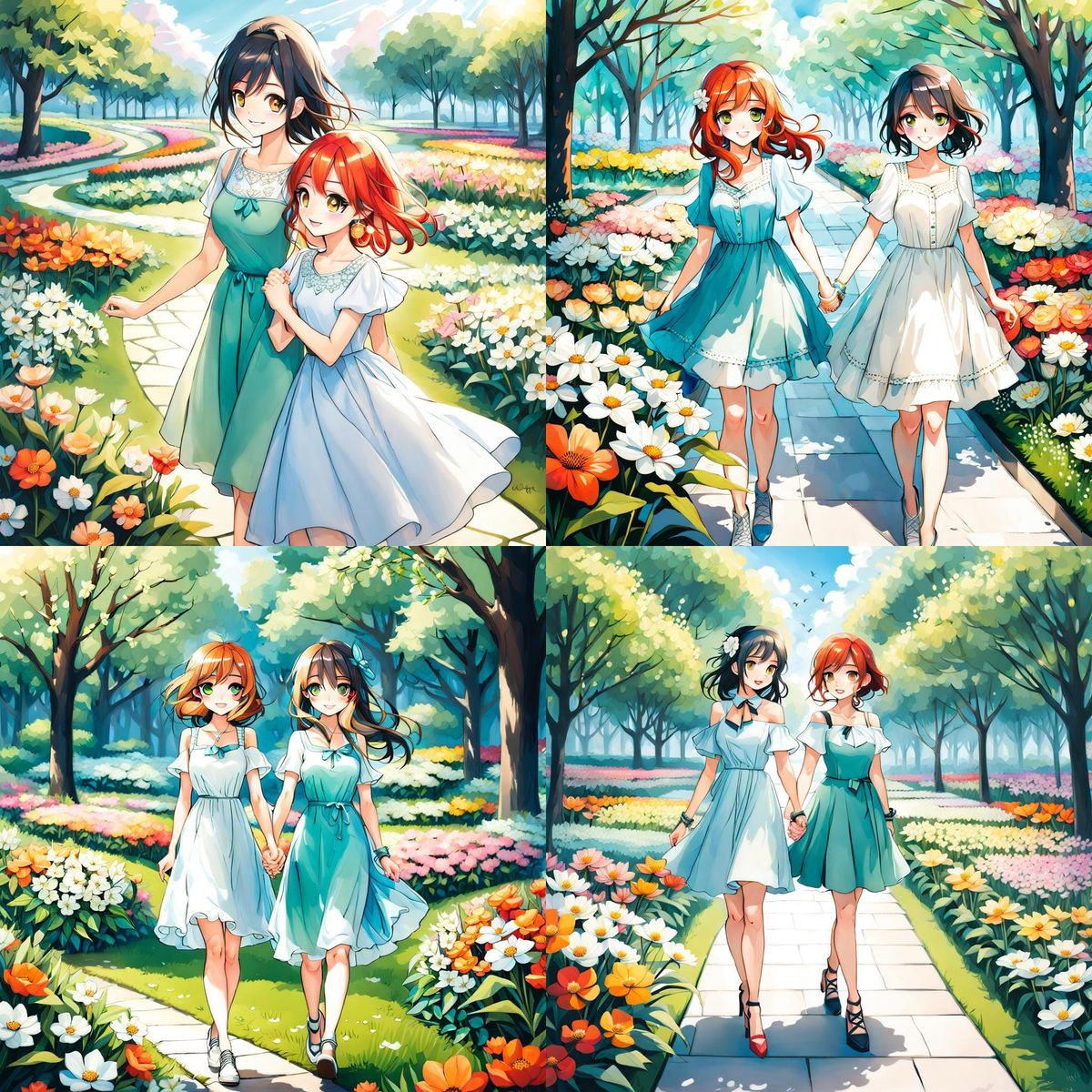 This image depicts two young women strolling hand-in-hand through a vibrant flower park. One woman is petite with long red hair and green eyes, while the other is taller with short black hair and brown eyes.