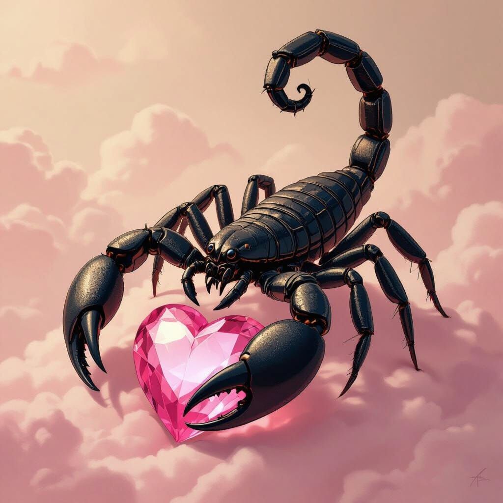 This image shows a detailed black scorpion with large claws on a pink gem. The sepia and black illustration features detailed textures and atmospheric lighting.