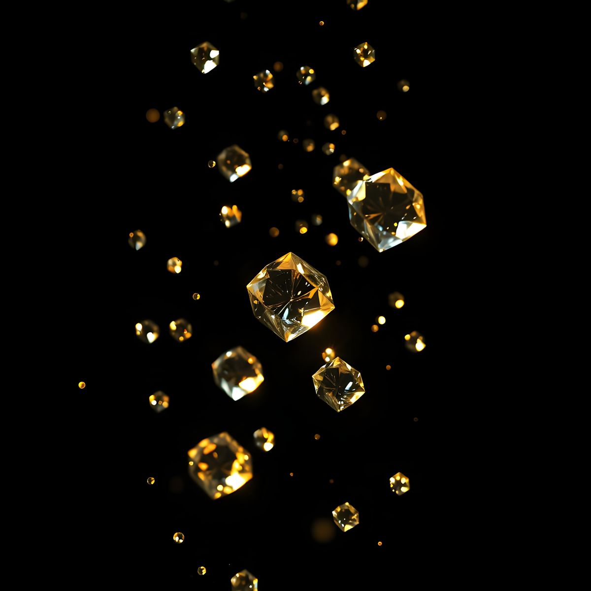 This image depicts shimmering diamonds suspended in mid-air, oscillating and falling from the sky, creating a golden aurora effect against a dark background, reminiscent of fine art photography with cinematic drama.
