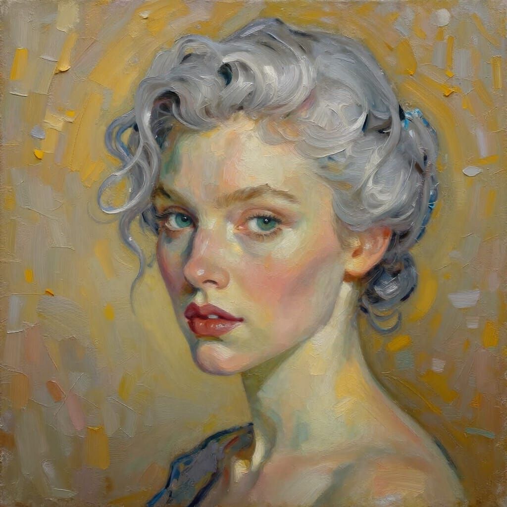 A portrait in oil, presents a focused portrait of a woman with a luminous complexion and short, elegantly curled silver hair. Her physical appearance is defined by striking green eyes and delicately flushed cheeks, while her expression is one of quiet, contemplative intensity as she gazes slightly off-center. Though her clothing is largely obscured, the suggestion of a dark garment at the bottom of the frame keeps the focus entirely on her features and poised, three-quarter turn posture. The artwork communicates a message of ethereal beauty and internal depth; the thick, impressionistic impasto brushstrokes and the warm, golden halo-like background create a mood of soft radiance. Symbolically, the contrast between the cool tones of her hair and the vibrant, energetic texture of the background suggests a serene spirit thriving amidst a chaotic or brilliant environment.