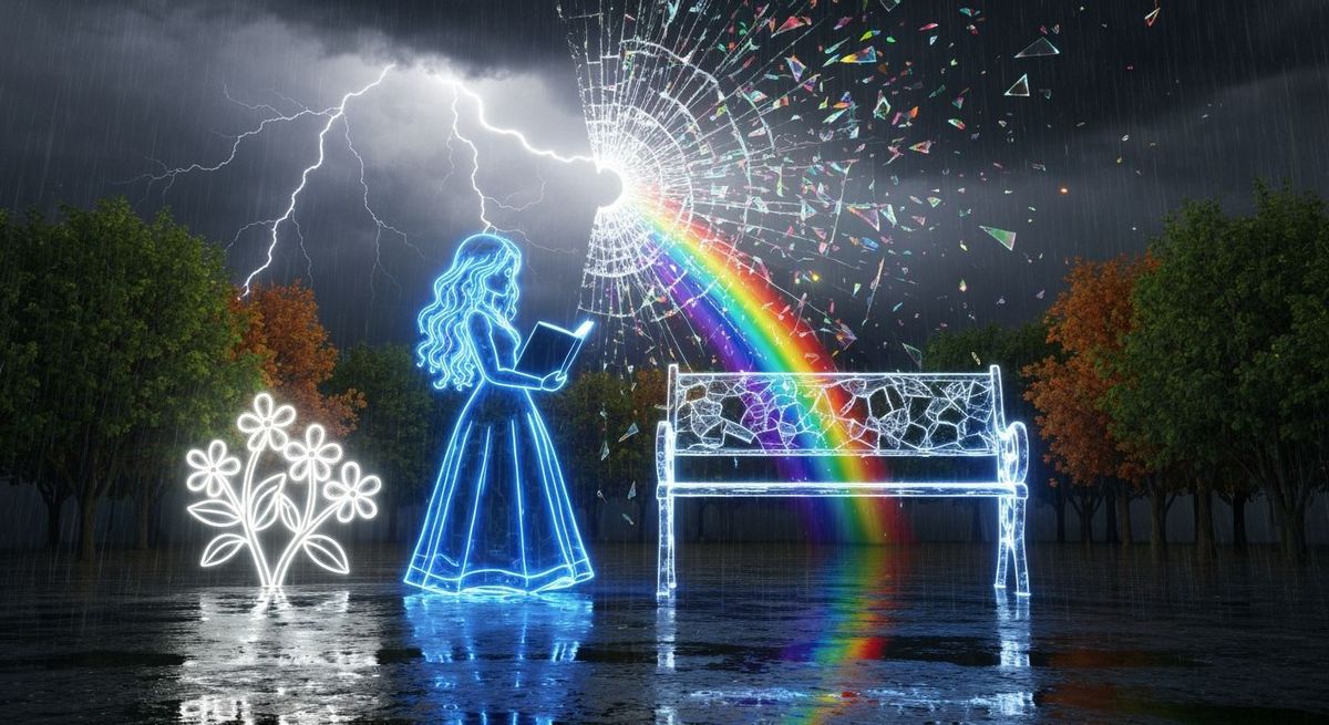 A surreal scene of a blue glowing girl holding a shattered rainbow, with glowing trees and a neon bench under a stormy sky with lightning. Hyperdetailed CGI.