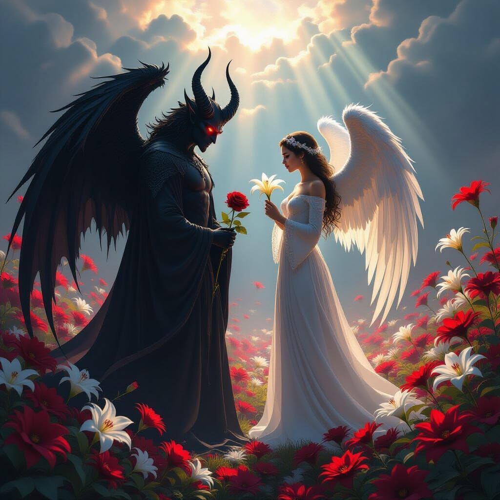 This digital painting depicts a demon and angel guarding each other amidst a burst of flowers. It features dramatic lighting, high contrast, and rich colors, evoking an epic fantasy concept.