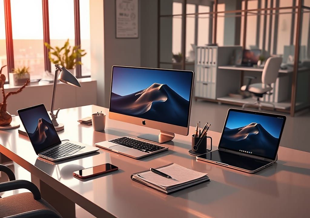 This image shows a modern workspace with a laptop, tablet, mobile phone, pen, and notebook on a sleek table. The scene blends photorealism with magical realism in a futuristic style.