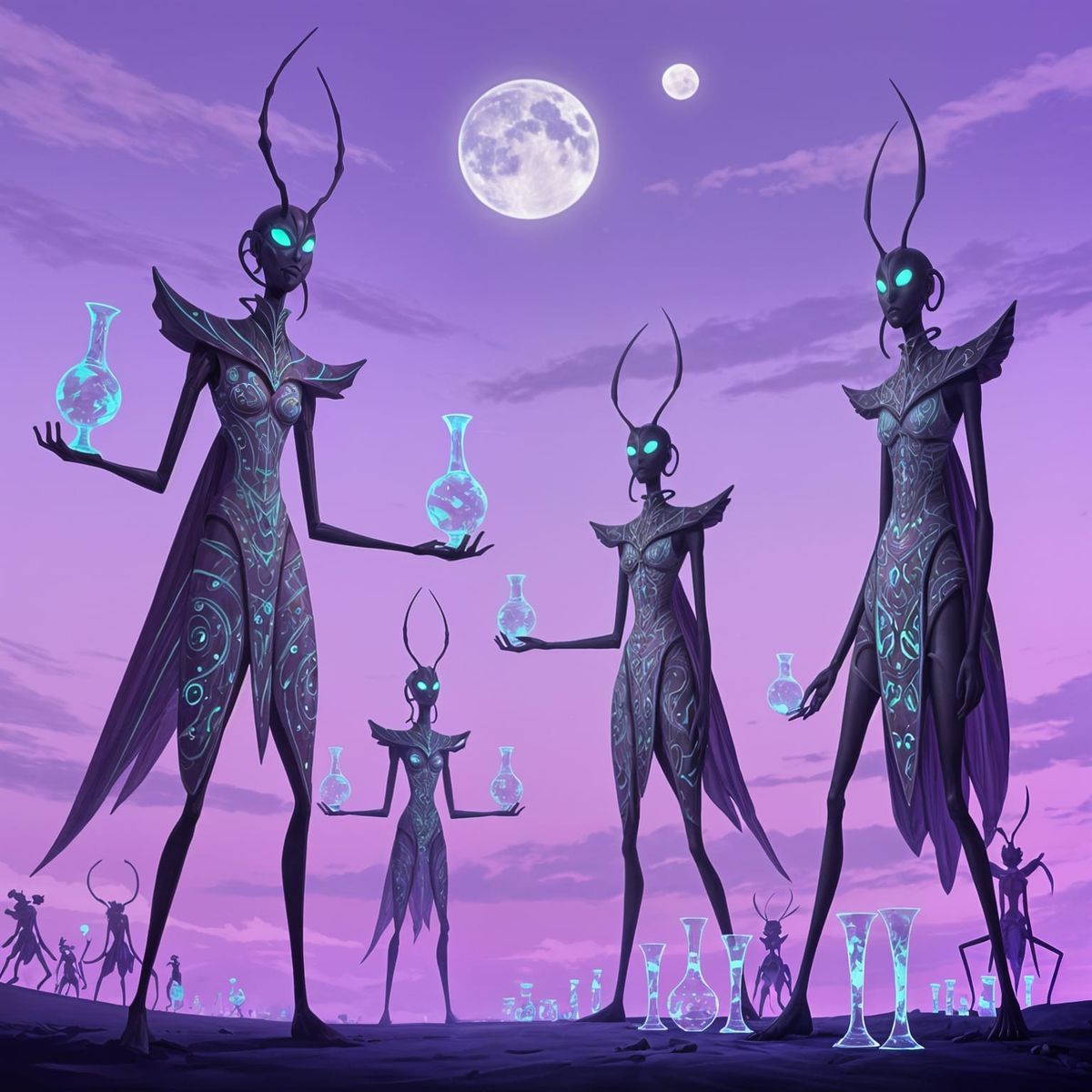 This image shows tall insectoid merchants proudly displaying kinetic glassware. Bioluminescent fabrics shimmer under twin moons in a soft, purple-gradient sky.