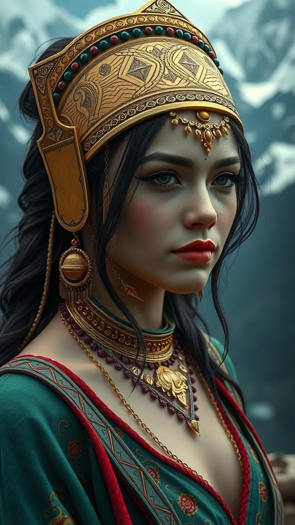 This image shows a stunning vray rendering of a regal woman set against Alaska's rugged landscape, with intricate golden engravings and dark, mystical tones inspired by Abyssus, and vibrant colors reminiscent of Japanese Whispers and surreal artgasm.