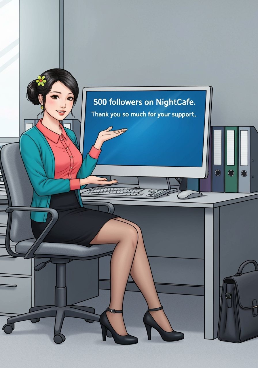 She's in her IT company, turns her chair around, gestures her hands towards her large desktop with its blue screen clearly shows 2 gigantic lines “500 followers on NightCafe." and "Thank you so much for your support.” written in white and large font size. Her tidy desk behind her is stacked with files, and her large dark-grey satchel rested on the floor beside it.