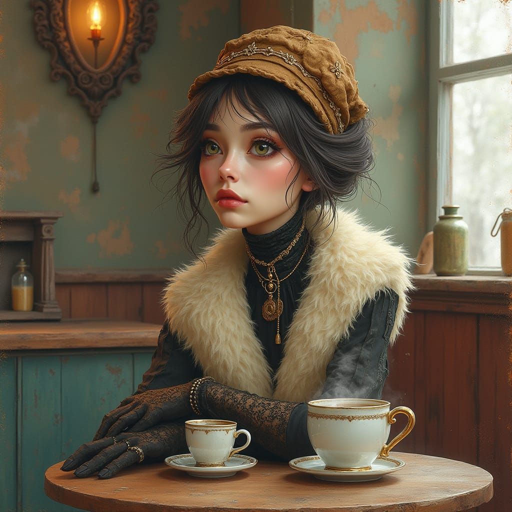 This image features a whimsical, high-fashion homeless woman sitting in a rustic cafe, surrounded by vintage decor and distressed wood accents. She's dressed in a luxurious, tattered couture ensemble, with a cup of coffee in hand, lost in thought. The piece blends elegance and grit, rendered in soft wate...
