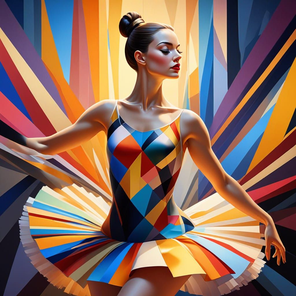 This image shows a ballerina in colorful attire. The medium shot captures the geometric patterns and vibrant textures of her tutu, illuminated by warm, golden lighting in an abstract expressionist style.