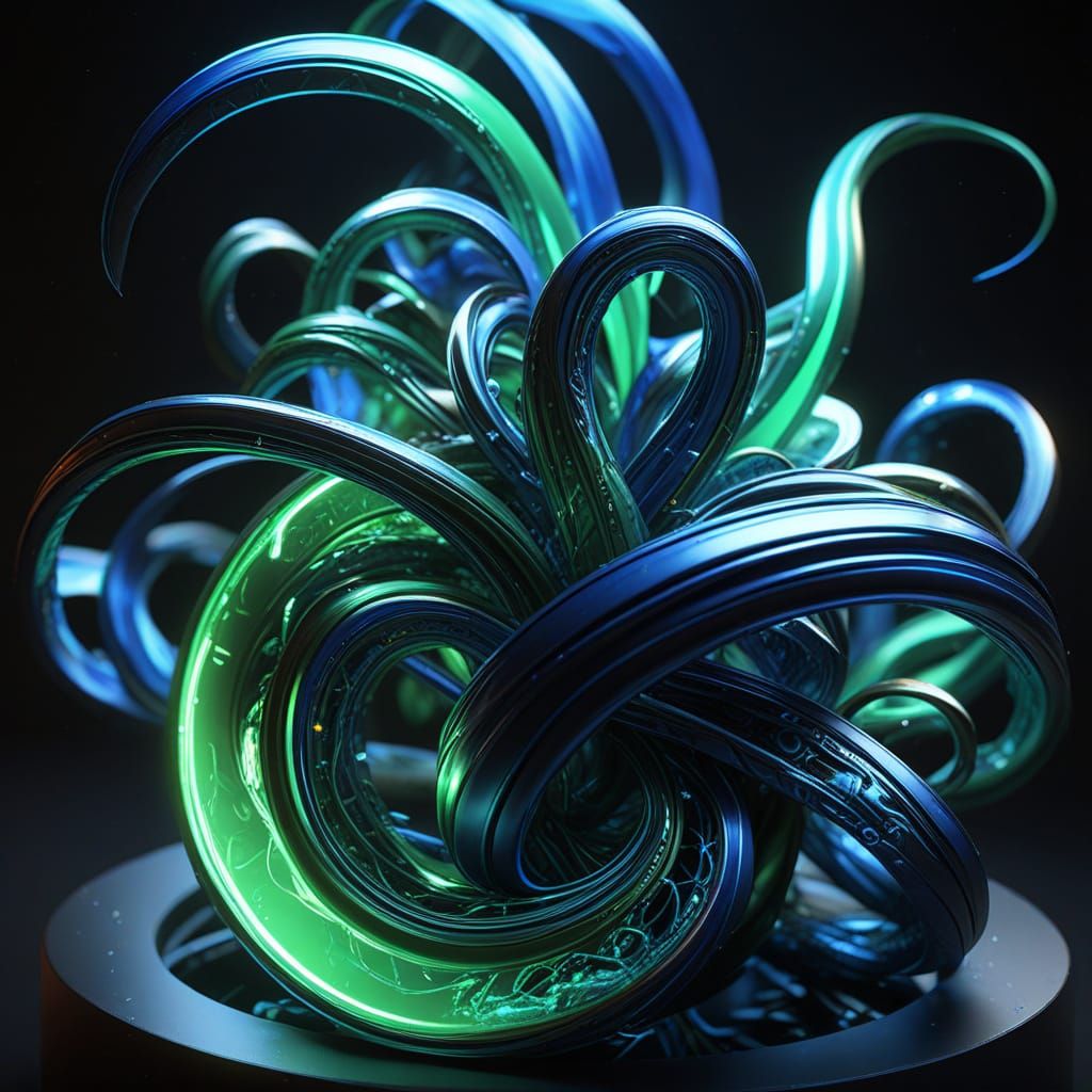 This image showcases an intricate, abstract sculpture with shimmering, pearlescent tendrils that twist and flow like liquid metal, set against a deep, black background with flashes of vibrant blue and green.