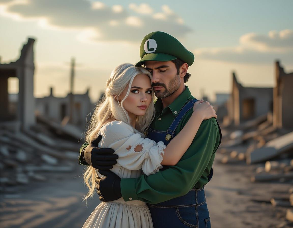 A hyperrealistic composite photo of Luigi and a white-haired woman, the last survivors on a ruined Earth, searching for the Star Rod. Cinematic lighting and film grain create a bleak, emotional ending.