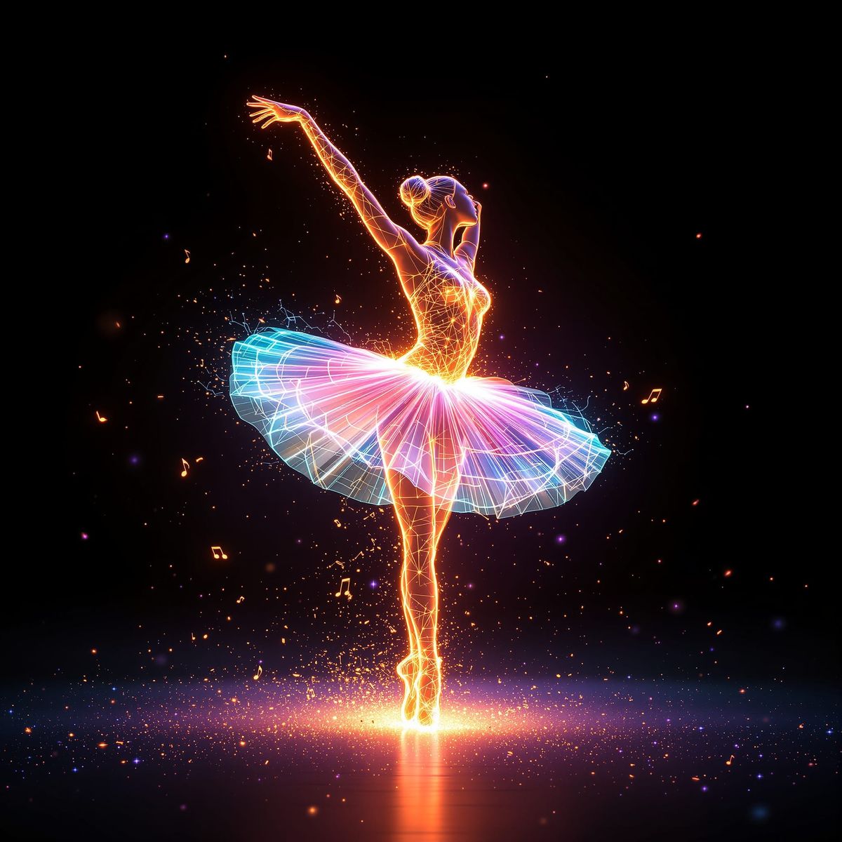 This image features a ballerina mid-pirouette, formed from glowing neon lines and electric filaments. Her tutu radiates orange, pink, and teal, with swirling energy waves and musical notes creating a dreamlike galactic stage.