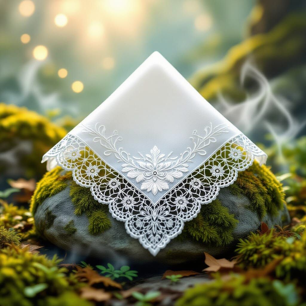 This image shows an embroidered handkerchief with lace trim on a mossy stone. The scene is filled with mist and soft, golden light, creating a whimsical and dreamlike ambiance.