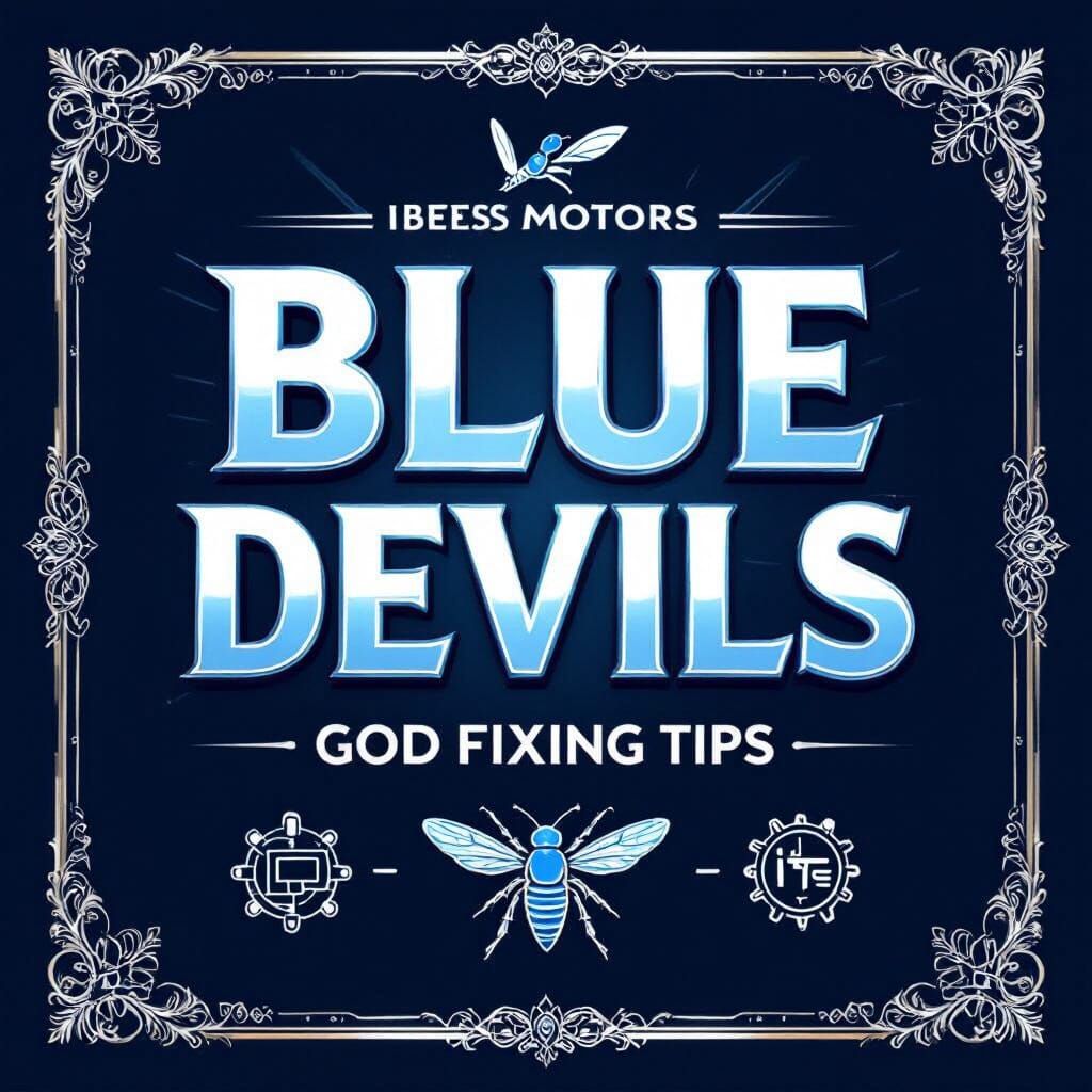 A futuristic logo design featuring the text BEES MOTORS BLUE DEVILS in bold capital letters. The logo has a metallic border, cricket player, IT symbols and a high-tech aesthetic.