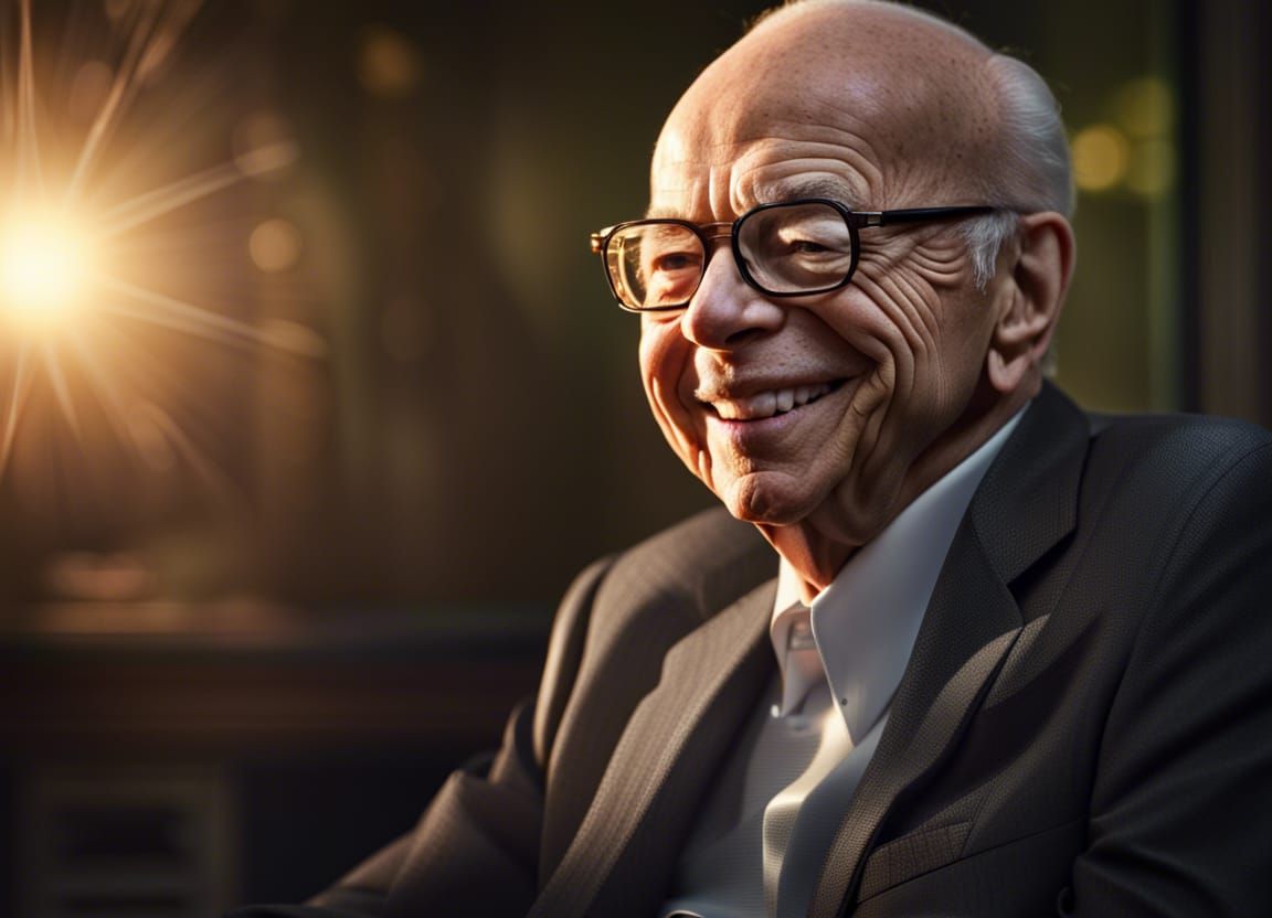 This ai-generated picture captures the essence of a Rupert Murdoch doppelgänger, confidently attired in a business suit, tie conspicuously absent, and trademark glasses. His grin reflects contentment, while a star-shaped yellow glimmer on the left discreetly nods to a source of his happiness: The Sun
