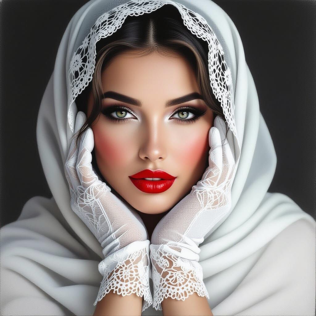 This image shows a striking noir portrait of a beautiful woman. The sketch uses pencil drawing techniques to create a blurred, sfumato effect with guipure gloves and a transparent shawl.