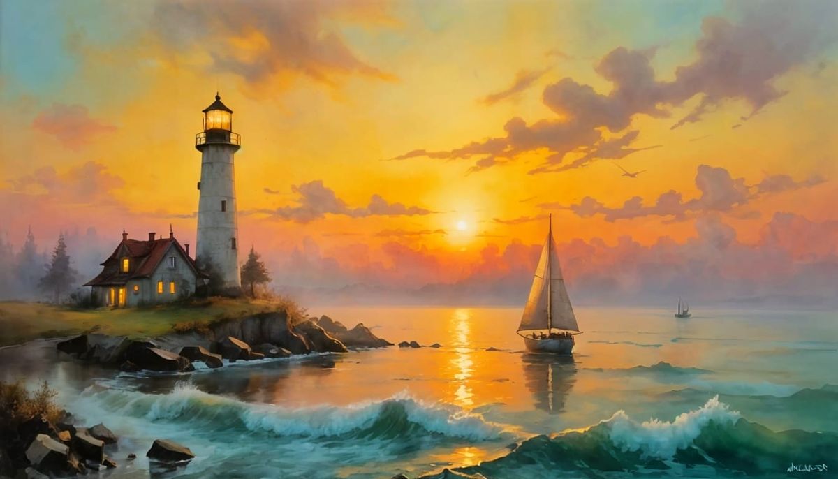 A vibrant image of a sunset featuring a lighthouse and sailboat. The scene is depicted with detailed fog and a colorful palette knife acrylic style, reminiscent of ethereal fantasy art.