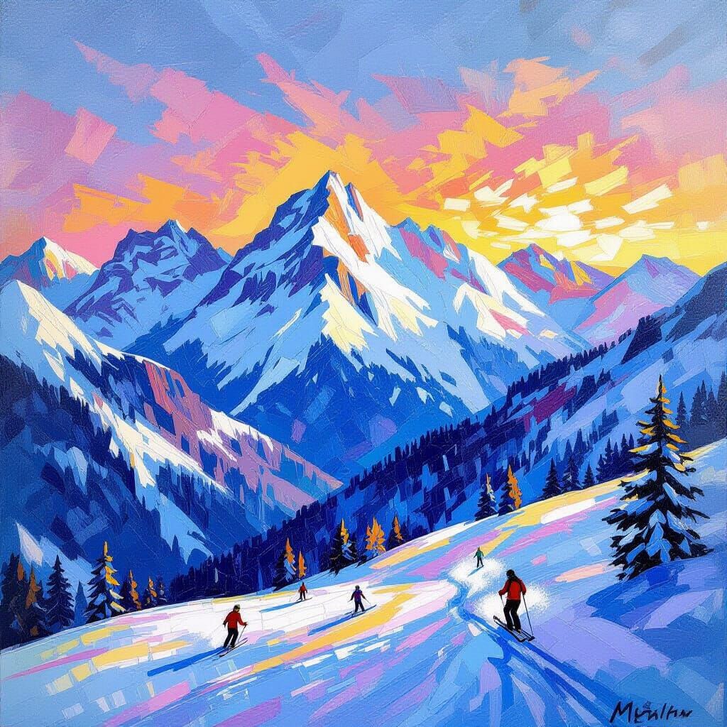 This image showcases the Swiss Alps in a vibrant pointillist style, capturing the majesty of skiing with meticulous detail and a lively color palette.