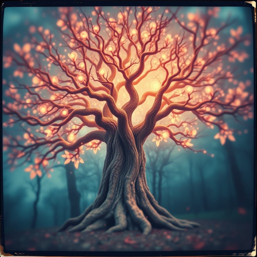 A fantastical tree radiates magic in a dreamlike scene, captured in a vibrant HDR style reminiscent of vintage film and Polaroid photography