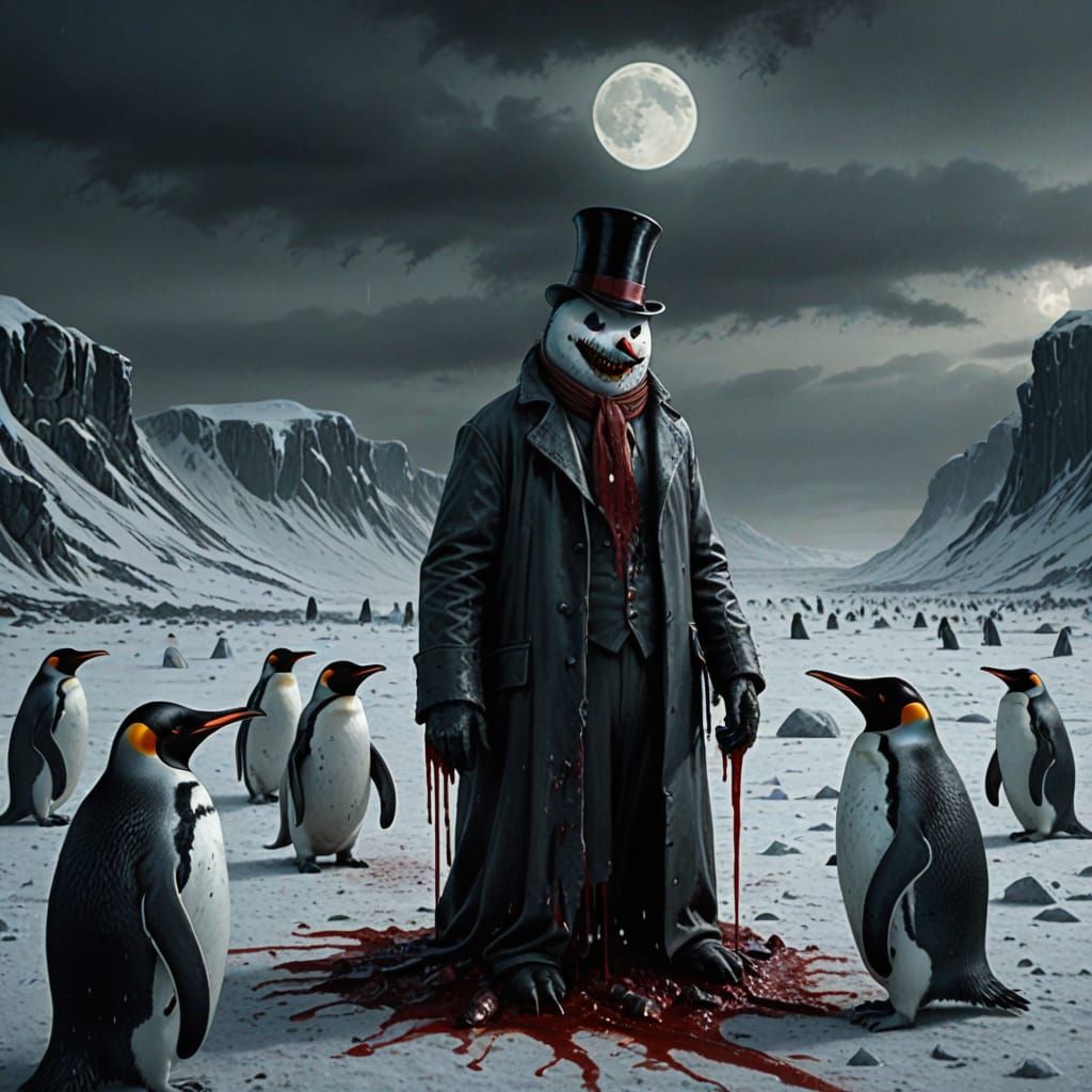 This image depicts a chilling, desolate landscape where penguins with sharp teeth confront Frosty the Snowman. The scene is rendered with unsettling textures and sinister lighting, creating a nightmarish, high-detail horror art piece.