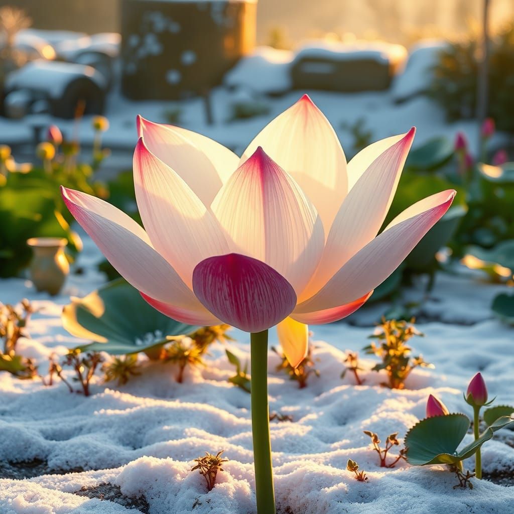 A striking picture of a Brahma lotus with white to pink petals, set in a snow-covered garden. The scene is lit by warm golden light in a dreamlike setting, as detailed matte painting.
