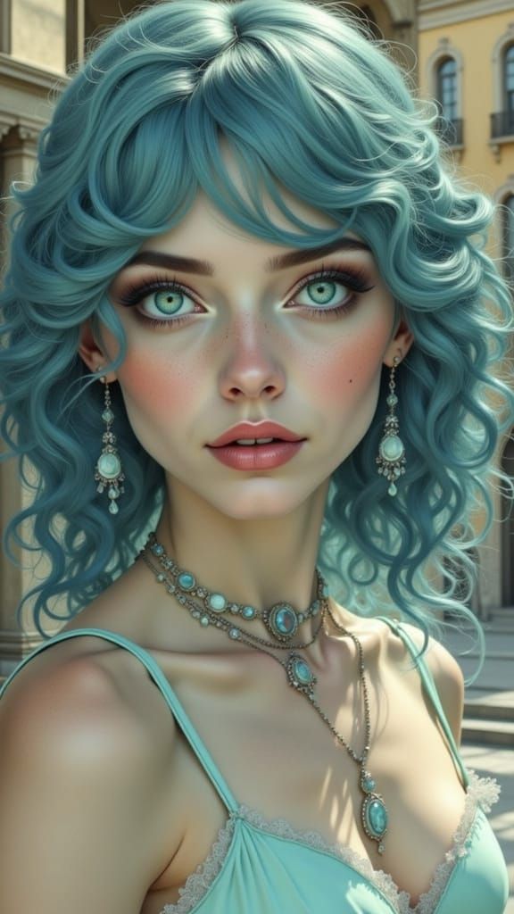 This image shows a young Victorian woman with turquoise hair and eyes walking in a dystopian city. The image uses soft pastel tones and intricate linework, reminiscent of Baroque and Renaissance styles.