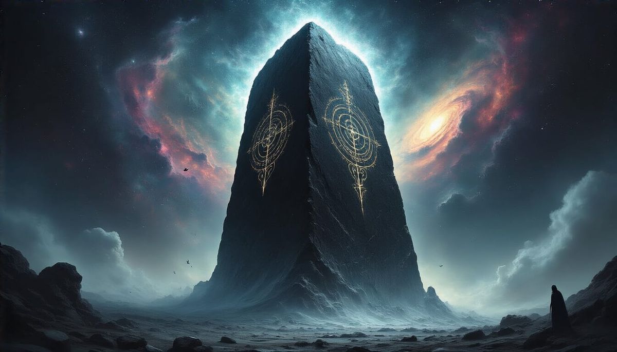 This image depicts a colossal obsidian monolith amidst a cosmic nebula, detailed in a blueprint schematic style with surrealist and cinematic elements, highlighting its vast, alien geometry.