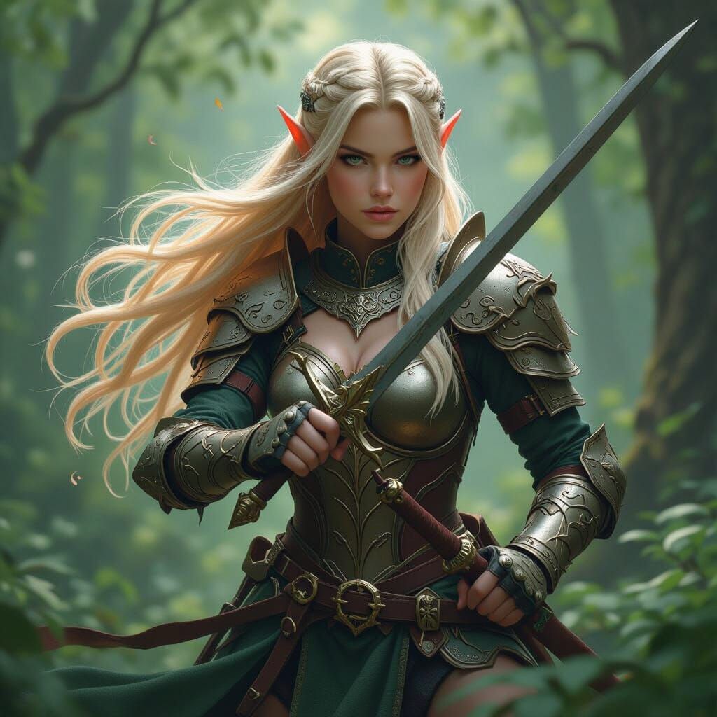 This image shows a warrior elf girl with long blond hair engaged in combat within a forest. She wears detailed armor. The artwork is a hyperrealistic matte painting with deep colors and fantastical elements.